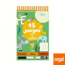 Diviértete en cualquier parte y en cualquier momento con los animales de este genial libro de formato pequeño con 45 pasatiempos y un rotulador borrable. ¡Llévalo siempre contigo! 45 juegos es una nueva colección de libro-juegos en un práctico formato pequeño con un rotulador borrable ¡para divertirse por todas partes y todo el tiempo! 45 juegos alrededor de un momento o situación (de vacaciones, de viaje, mientras esperas…) divididos en 3 secciones: 15 juegos de observación (busca y encuentra, juegos de sombras, juegos de las 7 diferencias, intruso, juego de parejas…), 15 enigmas (sudoku, crucigramas, sopas de letras, juegos de deducción, unir puntos, juegos gráficos, juegos de cálculo) y 15 laberintos. Con 5 páginas de soluciones al final.